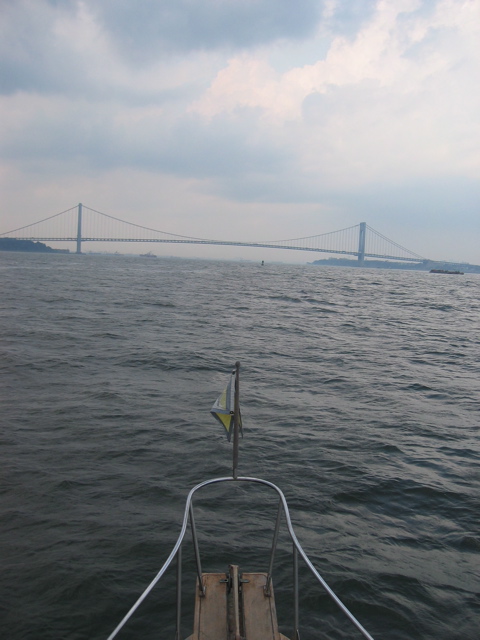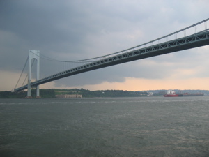 Weather approaches as we pass through the Narrows. At Long Last, A Last Long DayMixed Emotions Among the CrewLooking to our longest day yet of near 90 nautical miles, we woke at sunrise on our quiet Atlantic City anchor and were under way by 6:30. Turning left to continue up the coast, we found the Southerly breezes we'd been hoping for. They gave us a little boost and pleasant following seas as the endless New Jersey panorama unfolded. We were able to make 8.5 knots pretty much all day. At first at 1700 rpm, and then up to 1850. Our newly aligned starboard engine was running smooth! It was a nice day on the fly bridge, and time passed easily with a few interesting views of the coast to entertain us. At about 3:00, we found ourselves up around Sandy Hook. We had kept it open as a anchor spot if we weren't going to make it into the city by dark. We had been doing well all day though the weather was supposed to change for the worst. It appeared as though it was following us. We kept tuned to the weather station as they reported quick-forming thunder storms. One grazed us to the south, and we saw some more to the west. Passing the Romer Shoal Lighthouse, we could the Verrazano Narrows Bridge in the distance. We started a keen lookout for other vessels. The bridge felt like our doorway to the city. Bit by bit we got closer, meanwhile wondering when our weather luck would run out. As we passed under the bridge the water took on a oddly cartoonish quality. The combined experience of the giant span, the giant city on the horizon, and same giant dark clouds looming overhead, left us feeling surreally small. Though it was slack tide the boat slowed considerably in the Narrows as we lost the push of our following seas. We were in the Upper Bay now, and were glad to have a little more protection from the land that was closer to us. However, our view of New Jersey was increasingly unattractive and the weather radio was warning a long list of NJ and NY counties we'd never heard of with a coming thunderstorm and high winds. It felt prudent to start stowing the books, charts, cell phones, and other water fearing items. Sitting up on the fly bridge, we watched as New Jersey disappeared to our west. The rain began, and Hannah headed below to close the windows. Within a minute, the storm was upon our small craft. Tim stole a look at the compass to get a last bearing as Slowly was swallowed up by a heavy downpour. Tim brought the throttles way back. He kept one hand on wheel, and another holding the bimini top, trying to keep it from either collapsing or flying off all together in the wind. Communication was near impossible with the sound of wind and water. Hannah readied our little fog horn, sending out a test toot. A lone barge in the white let out its own low blow too. There was a moment of appreciation for remembering to raise the radar reflector earlier in the day. Forgivingly, before we had time to warm up the radar, the angry edge of weather blew through, leaving as quickly as it came. Soaked from our New York arrival christening, we were happy that it turned out to be only a short swell of exciting weather. We started to see the wonderful mix of color in the city's skyline. Letting two Staten Island ferries pass each other first, we made a slow break for the west side of the bay. The New Yorkers headed towards Manhattan, and we headed in for a good look at Lady Liberty. We weren't the only ones wanting a closer look either! Making our way up the Hudson, the mesmerizing skyline began to reveal its details. After passing historic Ellis Island we turned left into the canal leading to the Liberty Landing Marina. Jersey City has its own shiny skyline that looms over the boats of the marina. Happily, the air was now calm, and we had no problem navigating into our slip. The unique feeling of coming to New York by boat did not leave us after securing our lines to the dock. In a matter of hours, we had gone from crucruising atop the expansive openness of water, to being nestled in amongst many boats with an awesome view of Manhattan. On top of this bizarre transition, the tiredness had not yet left us from our weeks in Oriental cleaning, scrubbing, sanding, painting, and then our even hotter and harder spell in Portsmouth. Despite all of this, there is an infectious excitement to being in New York which perked us up a bit. Especially because we were buffered from the city by the Hudson. Of course, there was not much time to rest. There was work to do. We had just over a week to move into a new apartment in Ithaca and we had to clear and clean Slowly, finish projects, and get through a long check-off list. However, tonight we were going to relax a bit. After a quick tidy up, and closing up Slowly, we caught the 7:30 ferry 'Little Lady' into Manhattan, making our way towards Brooklyn to go see Tim's sister Sarah. The sky was still active as we pulled out into the Hudson, watching the ominous darkness hover over Slowly's new home and cruising grounds. |